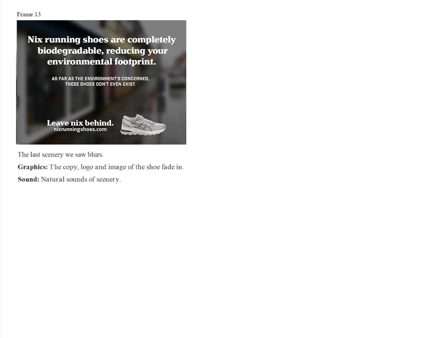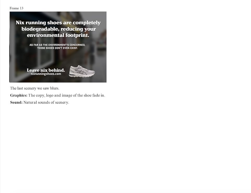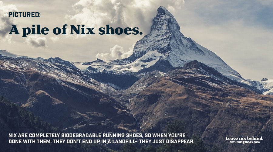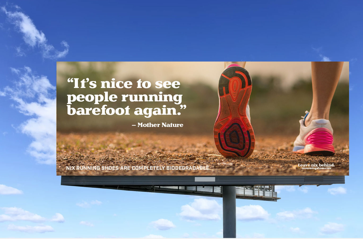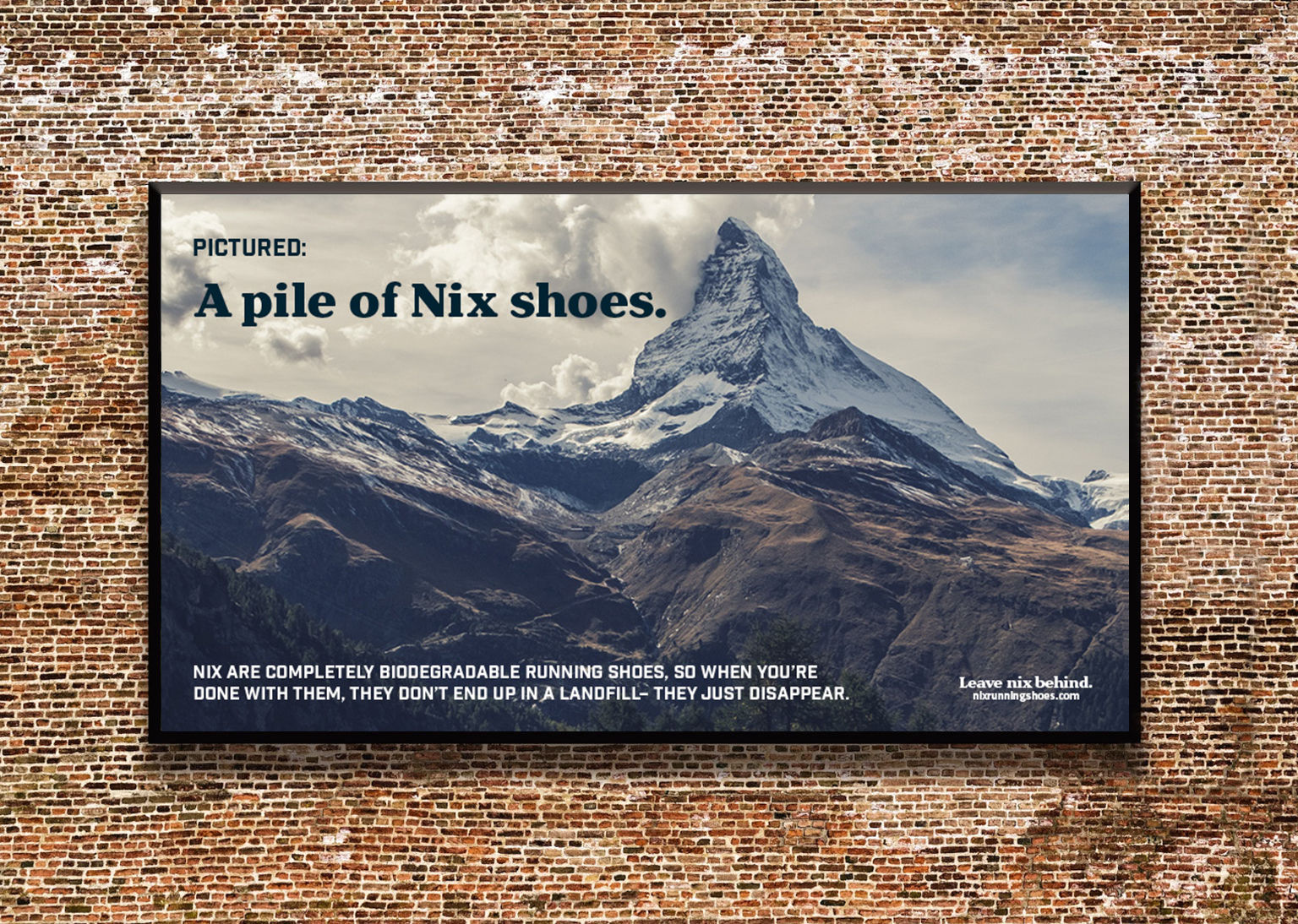 Which means they ultimately leave no impact on the environment. So, from the environment’s perspective, it’s like these shoes don’t even exist. I modeled a campaign around that idea and called them Nix Shoes.