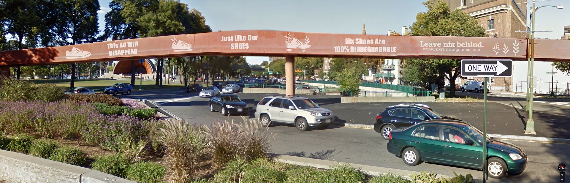 Pictured below is what my green graffiti ad might look like on the Arthur Fiedler Footbridge in Boston. Each shoe stencil will look progressively more disintegrated, in a timeline showing their return back to nature. The text stencils read "This ad will disappear. Just like our shoes. Nix Shoes are 100% biodegradable," followed by the slogan and website.